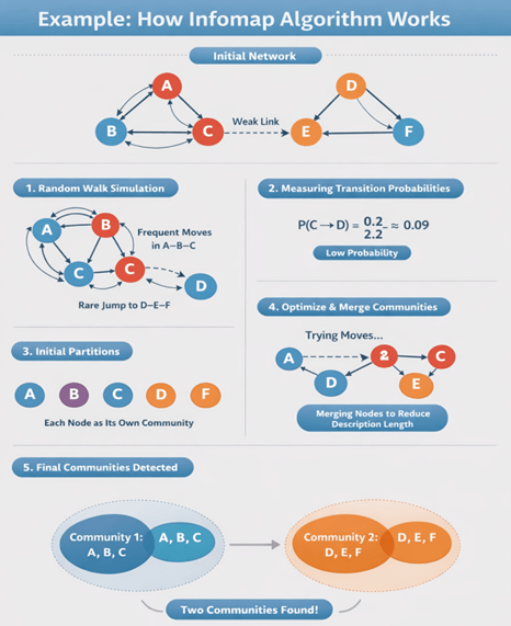 - Captures Flow Dynamics: Unlike many clustering techniques that only consider static connections, Infomap focuses on how information flows through the network. By simulating a random walker, it captures dynamic behavior, leading to more meaningful and realistic communities that reflect actual interaction patterns.