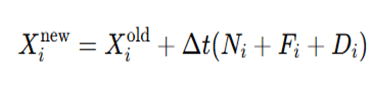 Where , Xi new is the updated position. Δt is the time step controlling movement. Ni, Fi, and Di are movement components.